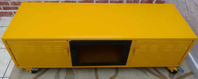 RACK COM 02 PORTAS COM VENEZIANAS ESTAMPADAS, 01 PORTA DE TELA DE ALUMÍNIO COM DETALHES EM REBITES, RODIZIOS GIRATÓRIOS DE 3'' COM FREIO, LATERIAS COM VENEZIANAS E PINTURA ELÉTROSTÁTICA A PÓ NAS CORES AMARELO E PRETO FOSCO