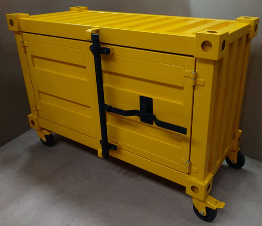 CONTÂINER COM 02 PORTAS, FECHO DETALHADO ESTILO CONTÂINER, LATERAIS, TETO E FUNDO COM DOBRAS ESTILO CONTÂINER, RODIZIOS GIRATÓRIOS DE 4'' COM FREIO, 01 PRATELEIRA INTERNA E PINTURA ELÉTROSTÁTICA A PÓ NA COR AMARELO E PRETO FOSCO