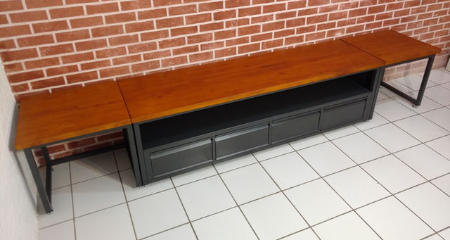 RACK COM TAMPO EM MADEIRA PINUS, COR IMBUIA, 04 GAVETAS COM CORREDIÇAS TELESCÓPICAS, PUXADOR EMBUTIDO, 02 NICHOS AVULSOS E PINTURA ELÉTROSTÁTICA A PÓ NA COR CINZA CHUMBO