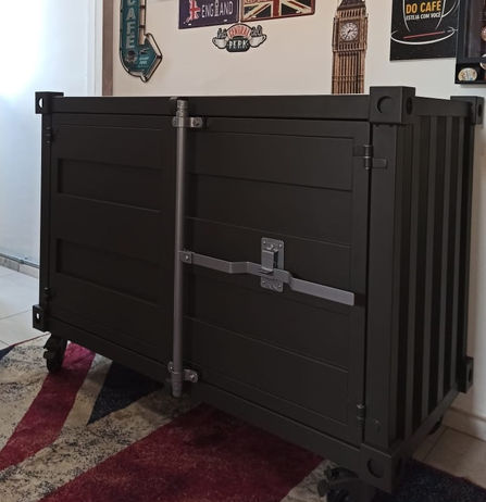 CONTÂINER COM 02 PORTAS, FECHO DETALHADO ESTILO CONTÂINER, TETO, LATERAIS E FUNDO COM DOBRAS ESTILO CONTÂINER, RODIZIOS GIRATÓRIOS DE 4'' COM FREIO, 01 PRATELEIRA INTERNA E PINTURA ELÉTROSTÁTICA A PÓ NAS CORES CINZA CHUMBO/PRATA